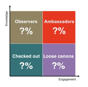 * The Ambassadors are your informal leaders. They are already committed and people listen to them. When dealing with changes in the organisation, you want to use your Ambassadors in the process. So if you find out how many you have and perhaps also who they are, your life gets so much easier. At the same time you will find out how many Observers, Loose cannons and Weak Links (Checked out).